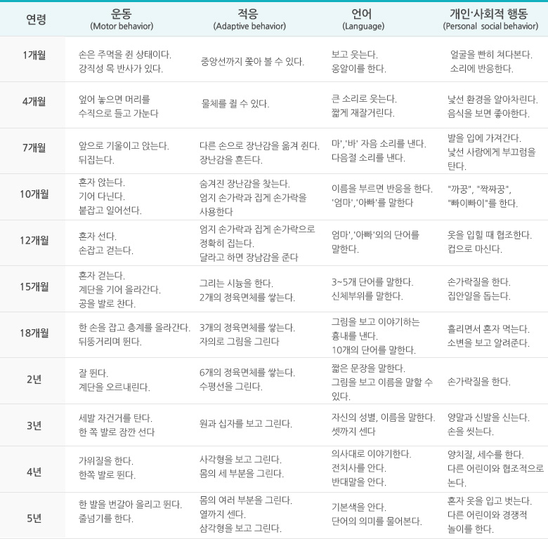 소아에서 1) 운동 2) 적응 3) 언어 4) 개인·사회적 활동의 4가지 항목에 따른 정상 행동발달의 과정을 요약하면 다음 표와 같습니다.